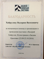 АНО "Дружная семья» от всей души благодарит художника Валерия Вагизовича Хайрулова за очень увлекательную и познавательную экскурсию по Музею изобразительного и декоративно-прикладного искусства Хайрулова В2 vk.com/club226201079. Экспозиция по теме «Картины Хайрулова по басням И.А. Крылова» впечатляет! Благодаря художнику Валерию Вагизовичу подопечные семьи окунулись в литературное творчество Крылова. В картинах ярко выражена мораль каждой басни, что особо привлекает внимание посетителей. В ходе экскурсии подопечные семьи также ознакомились с другими проектами художника: «Российские правители и цари», «СССР», «Широка страна моя родная», «Москва». Проекты носят познавательный и патриотический характер. Подопечные семьи окунулись в историю и узнали особенности каждого региона России. Объём работ художника - масштабен! За уникальность проектов В.В. Хайрулов объявлен почетным академиком «Международной Академии современного искусства», заслуженным членом «Петровской академии наук и искусств». Внесен в реестр рекордов России и Международного Агенства регистрации рекордов «Интеррекорд» в номинации «Автор шести уникальных тематических проектов живописи».